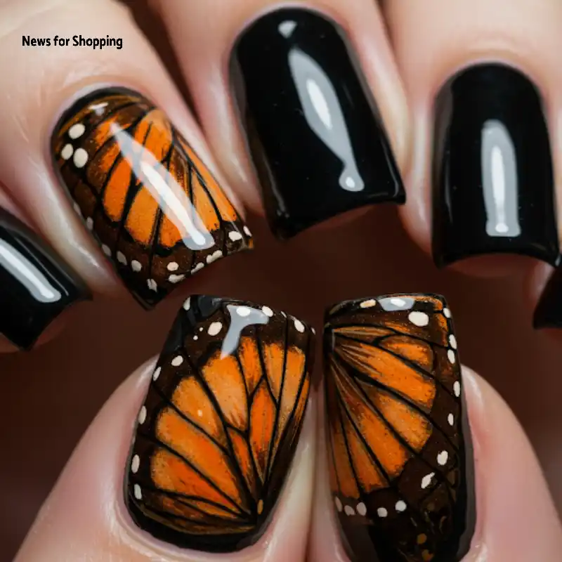 If you are looking for something more bold rather than something adorable, this is it. On glossy black nails, try creating whimsical butterfly wings using brown and orange colours. It offers a pure vintage look to the nails.