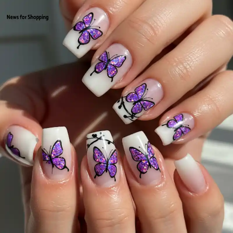 These butterfly nails designs truly fit the Y2K trend. On a milky white base, I created some adorable butterflies using purple glitter. Then, outline the wings carefully using black polish to put everything together.