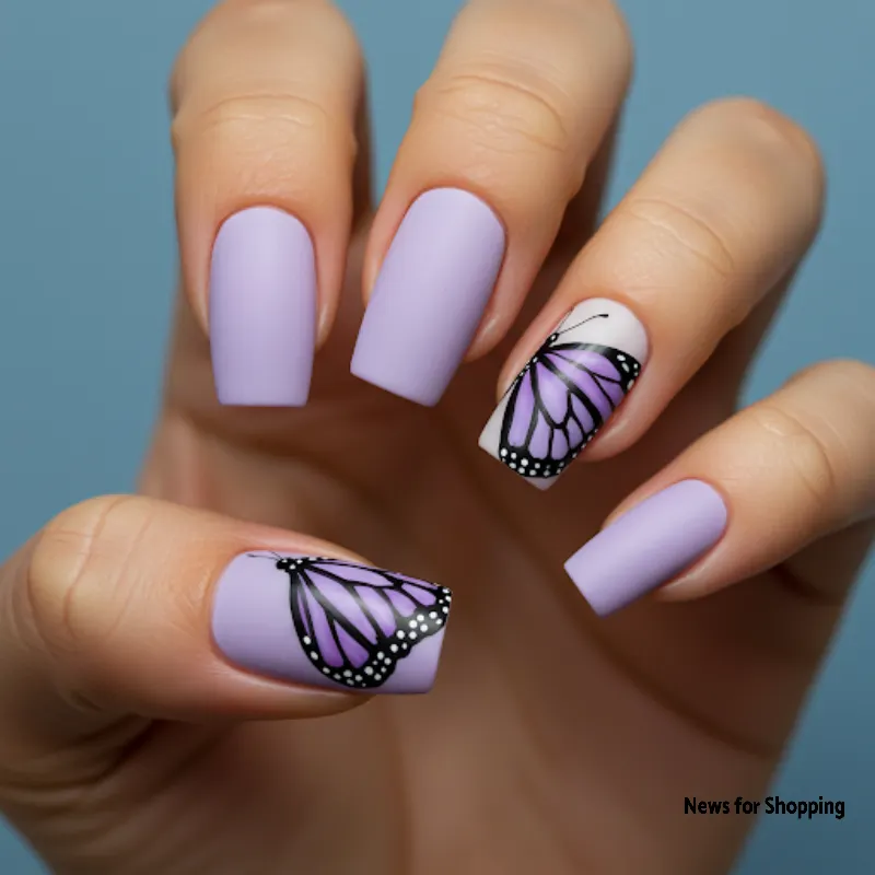 On matte light purple and white nails, create monarch butterfly wings using a black polish. You can also add tiny white dots for a realistic look. These butterfly nails are perfect for those who love aesthetic things.