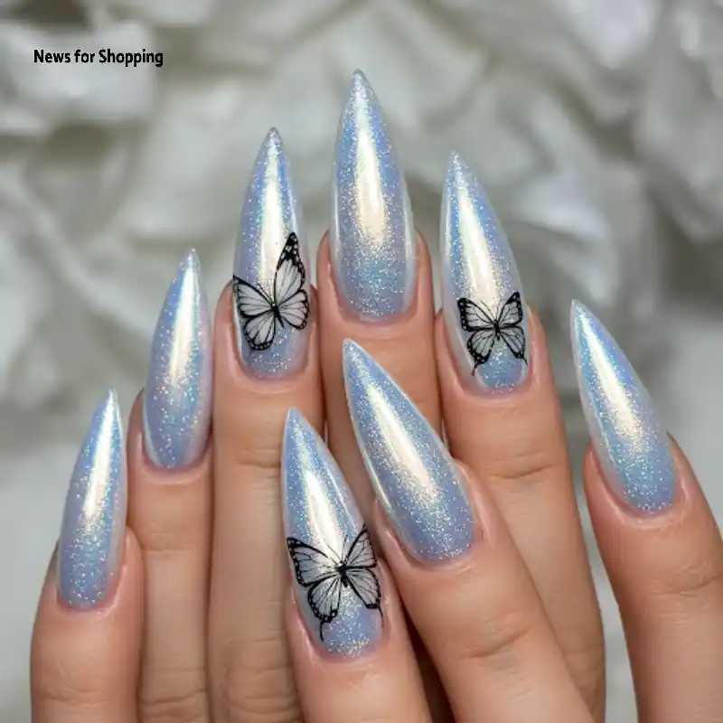 Want something more edgy and bold? Go for the stiletto nails. The butterfly designs on shimmery iced-blue stiletto nails make the overall design elegant. It is highly aesthetic and a perfect manicure for social media.