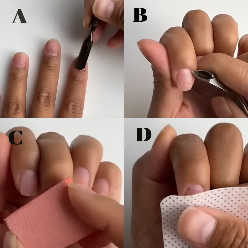 - Prepare the nails by pushing back the cuticles and cutting them carefully.