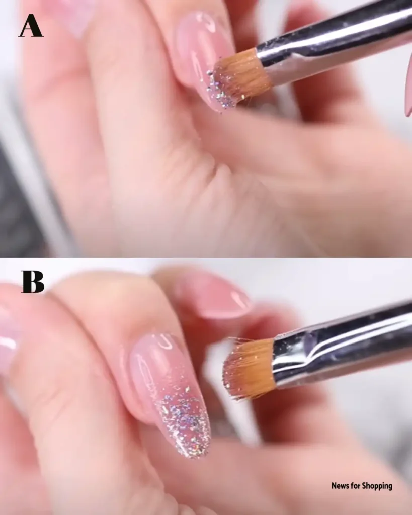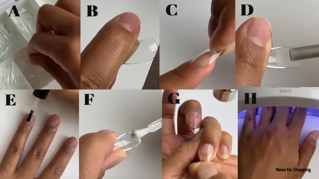 - Apply a thin layer of nail glue to the tips and place it on your nails at a 40° angle.