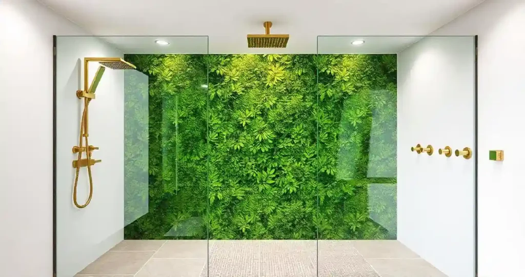 This is the most modern bathroom design idea. The walk-in-shower bathroom is designed in such a way, that the users can feel rainfall in their bathroom. It includes a wall with green accent tiles and other walls are painted in white with woven accents and brass fixtures.
