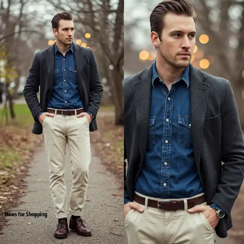 This style is totally chic. You can wear a turtleneck beneath and top with a denim shirt. Keep the first few buttons open and tuck the shirt in. This is a smart casual look for men, perfect for the fall season.