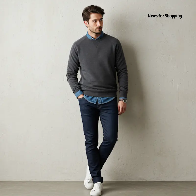 A denim shirt and a sweatshirt might not sound like a perfect combo. But believe me, it looks great. Choose well-fitted bottom wear and casual sneakers. Then put your sweatshirt on top of the denim shirt. Make sure to adjust the collars and shirt bottoms for that peaking effect.