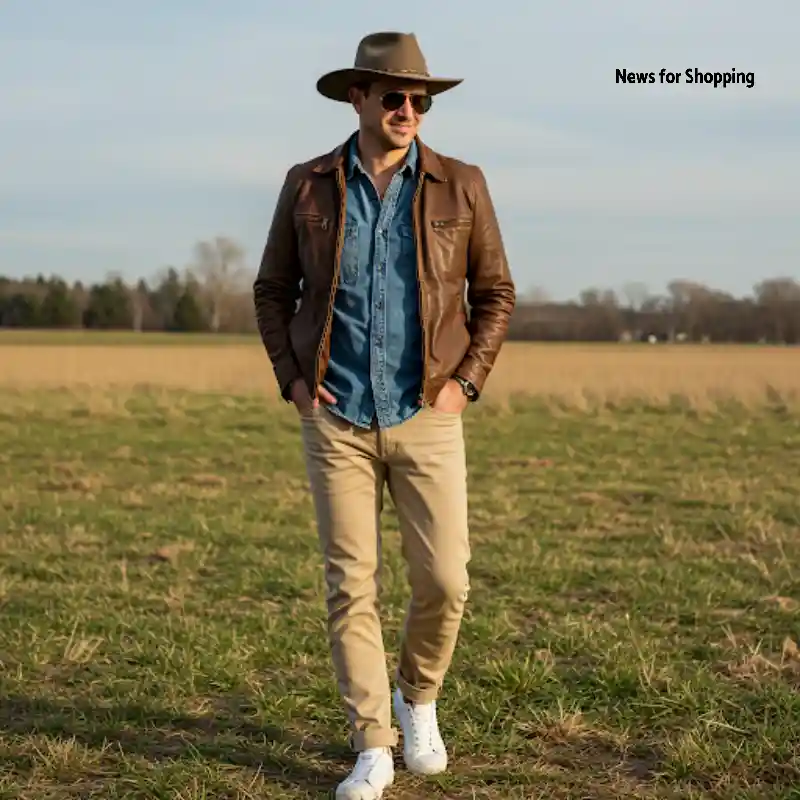 Leather jacket and denim shirt, a slaying combination. It is a classic American or cowboy style of outdoor fashion. It is more like an off-duty casual fit, perfect for a day out. You can elevate the style by adding real-fit cotton pants and casual sneakers. Do not forget your cowboy hat and sunglasses.