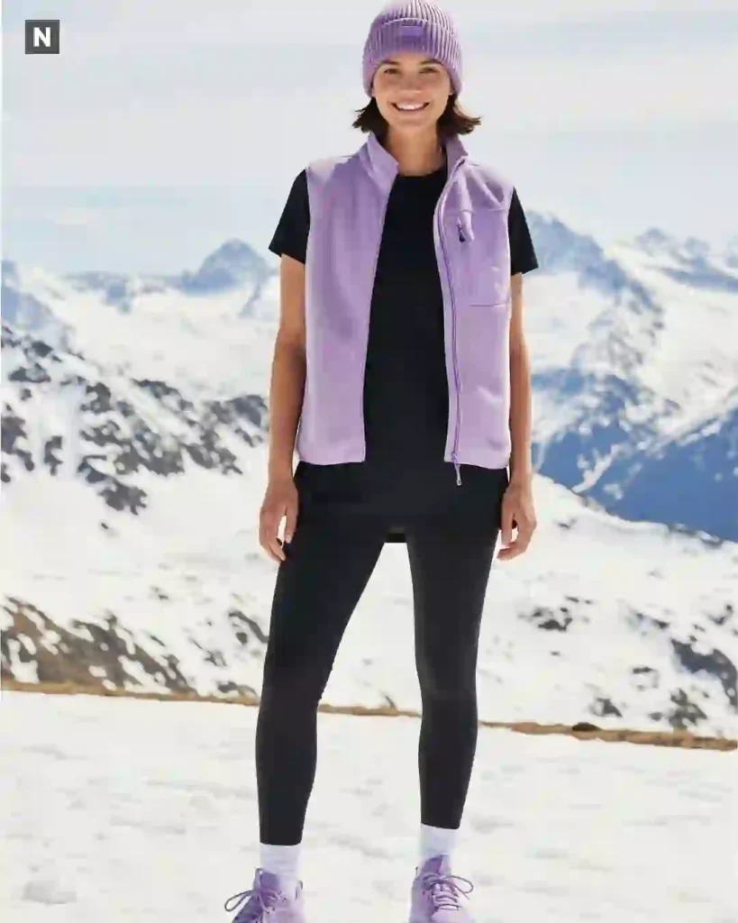 This all black base layer gives a bold vibe on its own. But the lilac sleeveless fleece adds a cute hue to this trek look. You can enhance the cuteness with a lilac sports shoe and a matching beanie. This look and the view will shake your Insta feed.