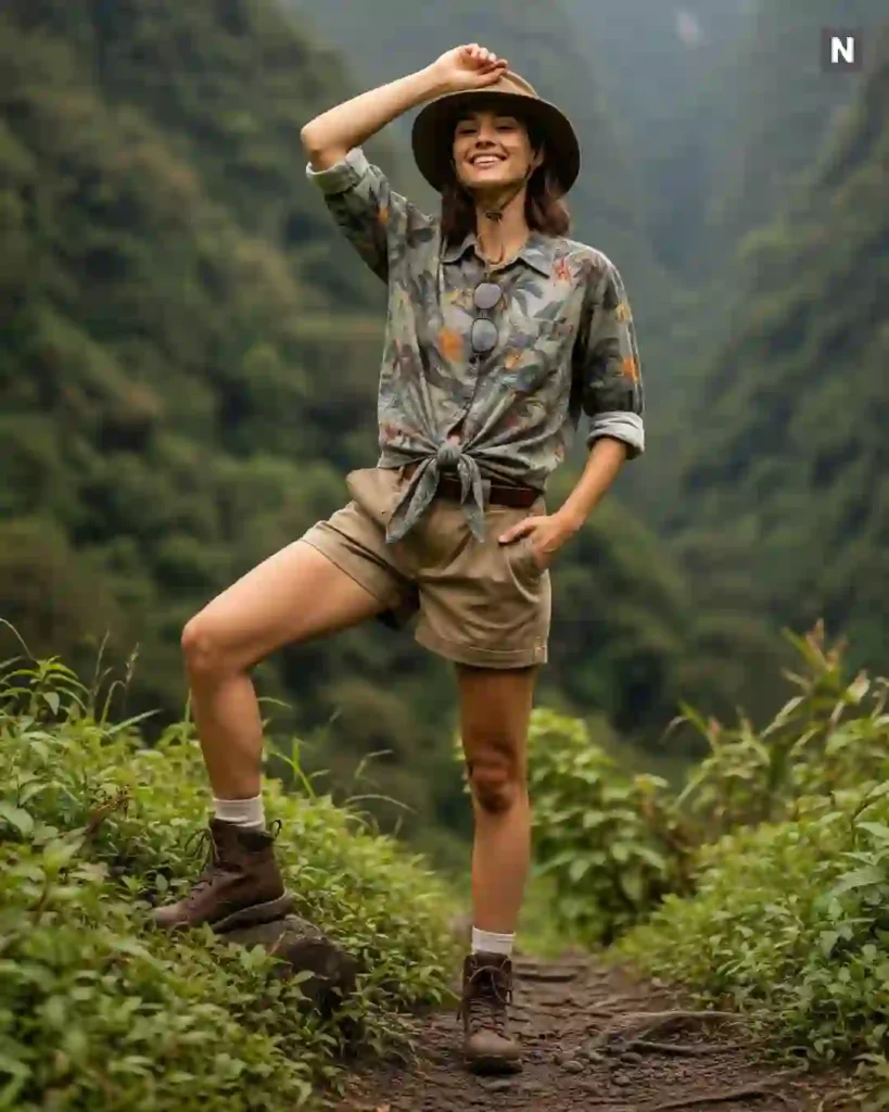 Here’s something different than usual trek outfits for women. Pairing a muted tone tropical print shirt with khaki shorts gives a more safari vibe. If you are planning a mountain jungle trek, you can totally look stylish in it. Wear a floppy hat to hold the look together.