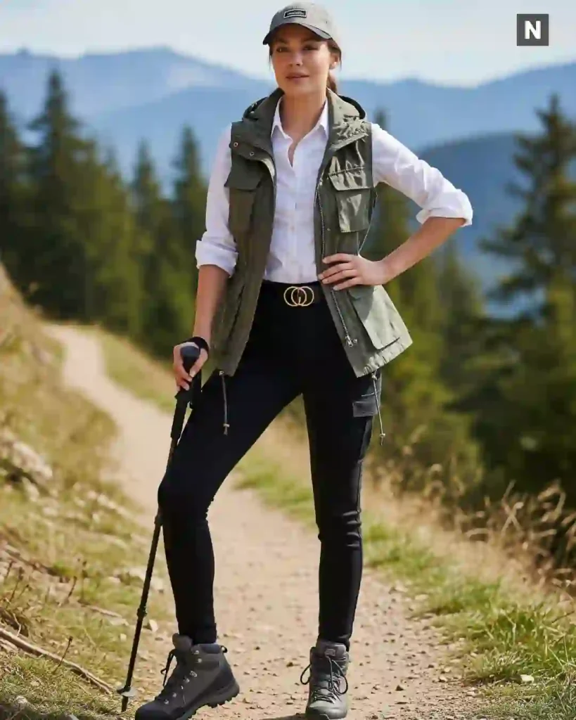 What about some cute yet classy Trek Outfits for Women? This is an effortlessly fashionable fit. To recreate this hiking look, pair a white shirt with a cargo waistcoat, black jeggings, and comfortable boots. Jeggings are great for trekking because of their comfortable stretch.
